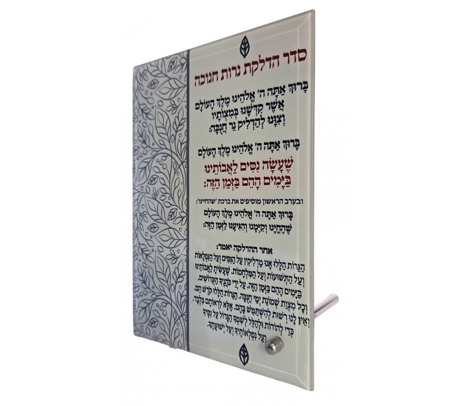 Add a graceful touch to your Chanukah celebrations with this glass blessing stand from Dorit Judaica. Featuring an elegant leaf motif, the design symbolizes growth and renewal, complementing the spirit of the holiday. The Menorah-lighting blessings are displayed clearly on the glass, offering both beauty and convenience.